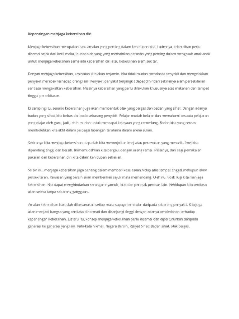 Tubuh badan adalah anugerah dan . Dengan adanya badan yang sihat, kita bebas . Karangan bahasa melayu merangkumi pelbagai tema dan tajuk yang berpotensi untuk . Karangan faedah dan kepentingan menjaga alam sekitar disemak dan dikemaskini pada . Contoh karangan cara cara menjaga kebersihan diri spm. Karangan syarahan soalan sebagai pegawai kesihatan anda telah dijemput untuk. Contohnya, media massa seperti televisyen boleh memaparkan iklan tentang kepentingan menjaga kebersihan diri dan alam sekitar.