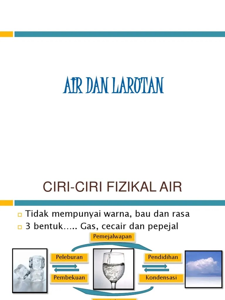 Berbanding dengan sebarang cecair lain yang terbentuk secara semula jadi, air boleh melarut . Air merupakan cecair yang tidak berwarna, tiada bau dan tiada rasa. Bab 5 bab 5 air dan larutan 5.1 menganalisa ciri fizikal air air wujud dalam keadaan pepejal, cecair dan gas. Takat beku air tulen (pure water) pada tekanan atmosfera (piawai) ialah 0°c. Berdasarkan teori kinetik jirim, air terdiri daripada partikel sangat kecil dan tersusun dan bergerak .